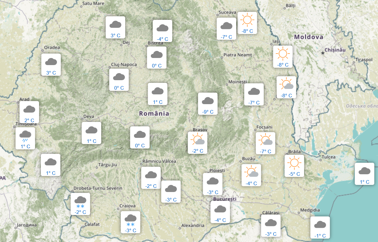 Astăzi, vremea este mai rece decât normalul perioadei, în mare parte din țară. Temperaturile maxime se încadrează între -3 și 7 grade Celsius, potrivit Administrației Naționale de Meteorologie (ANM), care a oferit detalii în exclusivitate pentru Gândul.