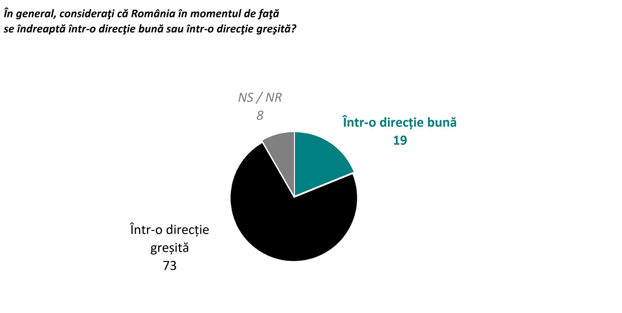 Datele sunt destul de dure. 73% dintre români spun că țara merge într-o direcție greșită. Doar 19% dintre respondenți cred că lucrurile merg într-o direcție bună. Practic, vorbim despre o minoritate care mai are încredere în evoluția actuală a României.