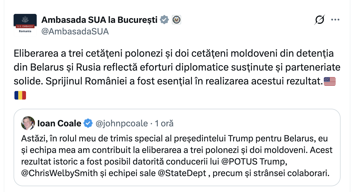 „Eliberarea a trei cetățeni polonezi și doi cetățeni moldoveni din detenția din Belarus și Rusia reflectă eforturi diplomatice susținute și parteneriate solide. Sprijinul României a fost esențial în realizarea acestui rezultat”, scrie ambasada SUA la București, condusă de Darryl Nirenberg.