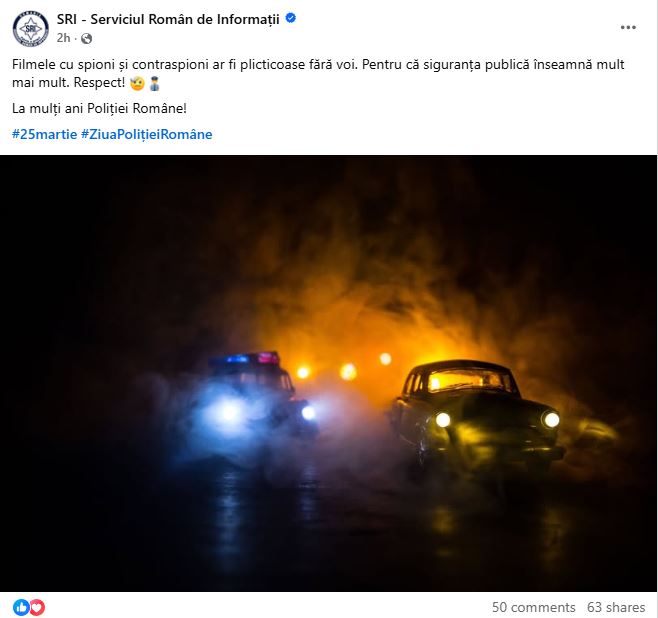 „Filmele cu spioni și contraspioni ar fi plicticoase fără voi. Pentru că siguranța publică înseamnă mult mai mult. Respect! La mulți ani Poliției Române! #25martie #ZiuaPolițieiRomâne”, se arată în mesajul postat pe Facebook.