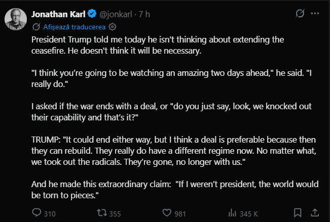 Trump dă de înțeles că nu va prelungi armistițiul cu Iranul și sugerează că operațiunea SUA se apropie de final. „Veți asista la zile extraordinare“