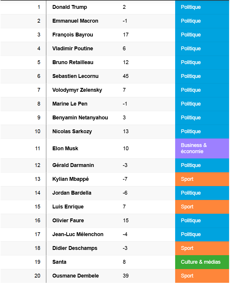 Potrivit barometrului Tagaday al celor mai mediatizate 1.000 de personalități ale anului 2025, publicat de Ouest-France, cea mai menționată persoană din presa franceză a fost nimeni altul decât Donald Trump. Pentru prima dată de la lansarea studiului în 2013, președintele în exercițiu al Franței nu ocupă prima poziție în topul vizibilității mediatice. Tagaday este o platformă de monitorizare a presei care publică clasamente cu personalitățile cele mai mediatizate în presa franceză, inclusiv cele de al TV, radio, print sau online.