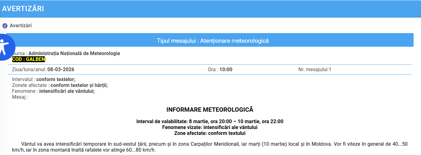 Potrivit ANM, Vântul va avea intensificări temporare în sud-vestul țării, precum și în zona Carpaților Meridionali, iar marți (10 martie) local și în Moldova. Vor fi viteze în general de 40…50 km/h, iar în zona montană înaltă rafalele vor atinge 60…80 km/h.