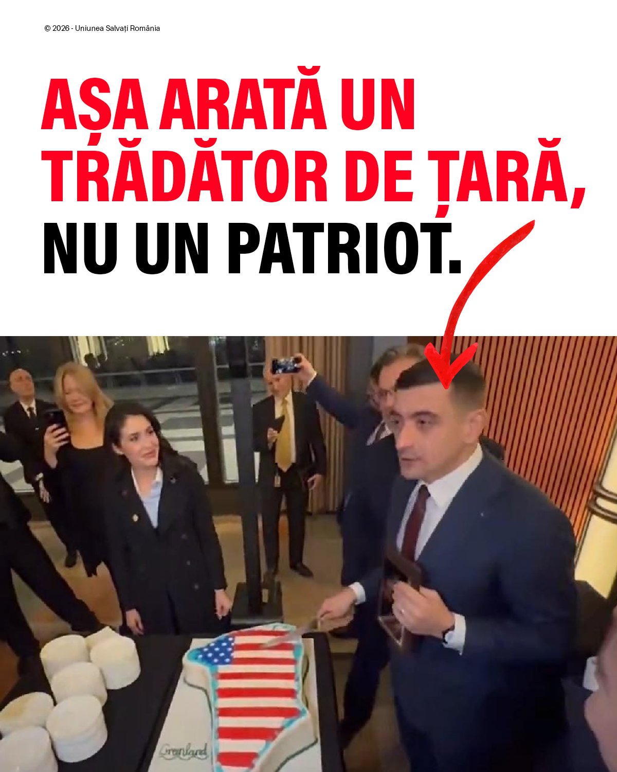 „George Simion a dovedit că nu dă doi bani pe suveranitatea unei țări. Dacă azi taie un tort cu forma Groenlandei, mâine ar tăia fără să clipească tortul în forma României ca să-l mulțumească pe Vladimir Putin”, scrie USR pe Facebook.